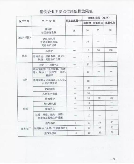 2018年10月底前,全市所有鋼鐵企業(yè)(含獨(dú)立球團(tuán)、高爐鑄造企業(yè),下同)全部達(dá)到超低排放水平(限值參照驗(yàn)收標(biāo)準(zhǔn),通過(guò)168小時(shí)運(yùn)行且第三方監(jiān)測(cè)達(dá)標(biāo),95%以上小時(shí)均值排放達(dá)標(biāo)),并完成濕煙氣脫白治理,凡達(dá)不到標(biāo)準(zhǔn)的實(shí)施停產(chǎn)整治。