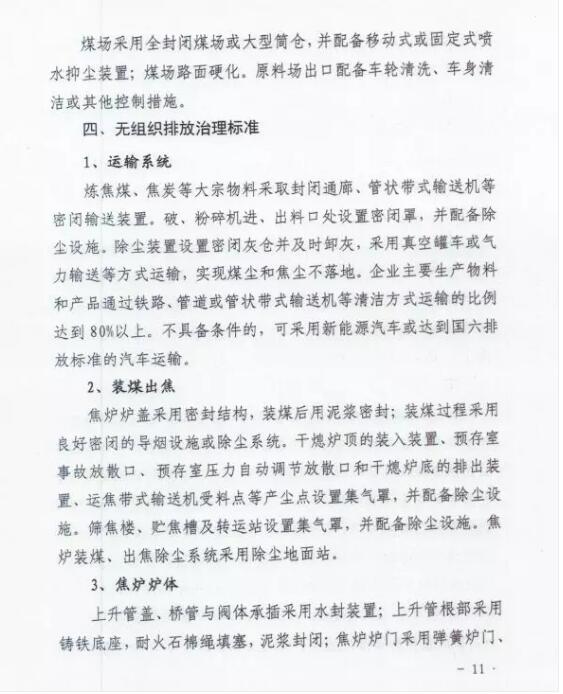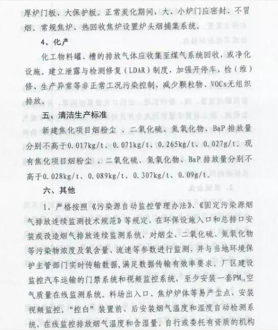 2018年9月底前,全市所有焦化企業(yè)全部達(dá)到超低排放水平(限值參照驗(yàn)收標(biāo)準(zhǔn),通過(guò)168小時(shí)運(yùn)行且第三方監(jiān)測(cè)達(dá)標(biāo),95%以上小時(shí)均值排放達(dá)標(biāo)),并完成濕煙氣脫白治理改造,凡達(dá)不到標(biāo)準(zhǔn)的實(shí)施停產(chǎn)整治
